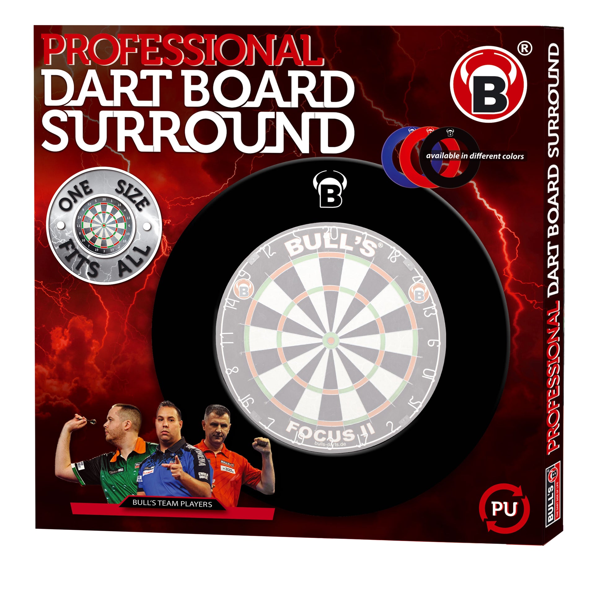 Das professionelle PU-Surround hat eine Stärke von ca 3,5 cm. Das PU-Material schützt die Wand vor Beschädigungen und minimiert die Anzahl herunterfallender Darts, dadurch werden auch die Darts und der Boden geschont. Die neue verbesserte Passform mit einem Innendurchmesser von ca. 45 cm, passt perfekt auf jedes uns bekannte Bristle Dartboard.-> One size fits all. Der Auffangring lässt sich einfach auf die Dartscheibe montieren. Die Breite des Schutzringes beträgt ca. 12 cm, dies bietet genügend Schutz für die Wand, auch für ungeübte Dartspieler. Der Gesamtdurchmesser des BULL'S Pro Dart Board Surrounds beträgt 68 cm. Erhältlich in den Farben schwarz, rot und blau.