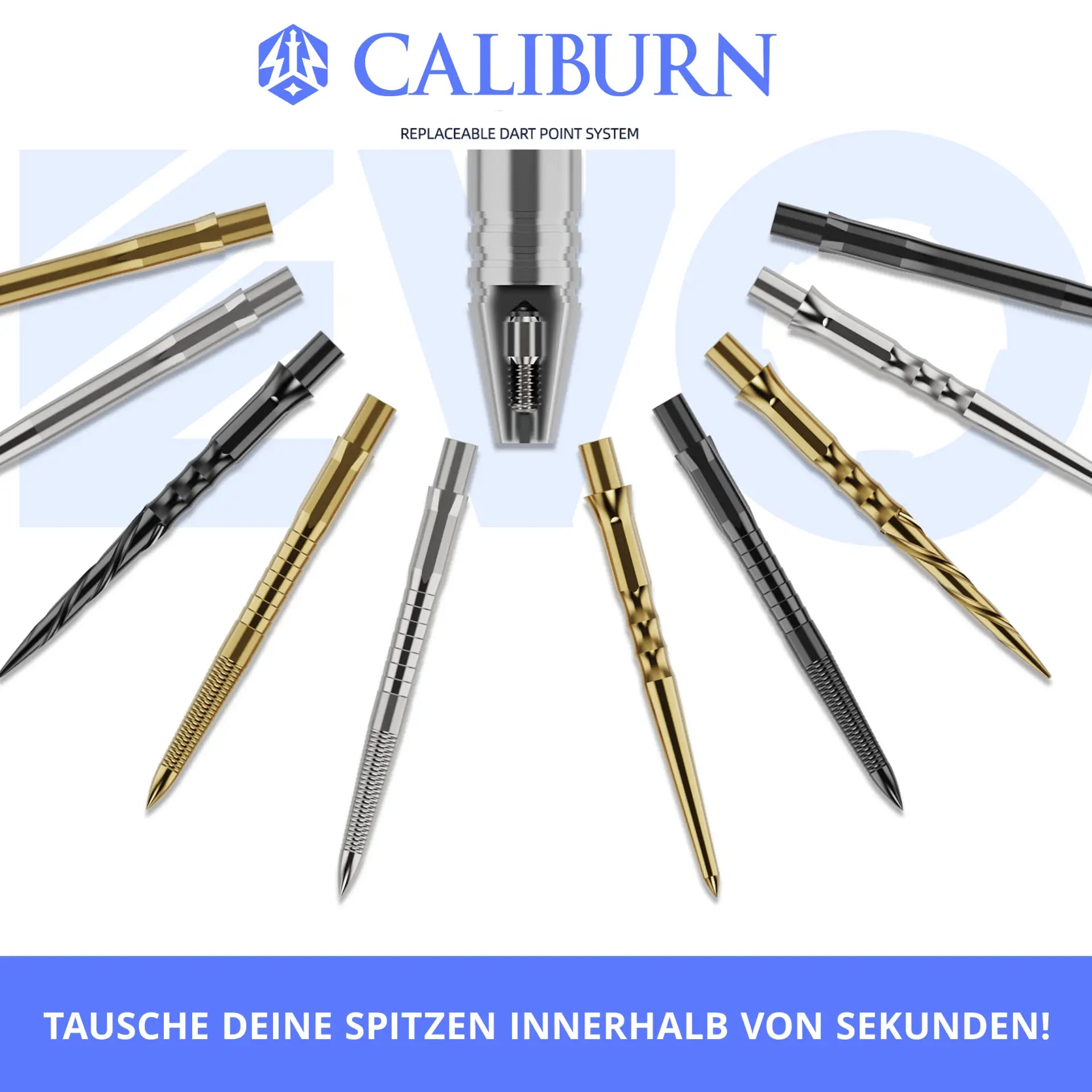 Im Lieferumfang des Caliburn Starter Kits befinden sich 1x Set EVO Steeltips (32mm), 3x Sets EVO Spigots (2,33mm, 2,34mm, 2,35mm), ein EVO Repointing Tool sowie ein EVO Wechselspitzen Tool.