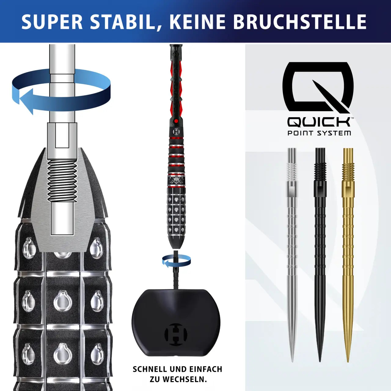 Harrows Quick Point HM Grip Spitzen in Silber – austauschbar in Sekunden. Im Gegensatz zu klassischen Steeldarts werden die Spitzen präzise in ein Gewinde eingeschraubt statt eingepresst. Das ermöglicht schnellen Wechsel je nach Spielsituation und Vorliebe. Experimentieren Sie mit verschiedenen Längen und Farben – ob zuhause oder auswärts. Die moderaten Ringgrifelemente bieten sicheren Halt.