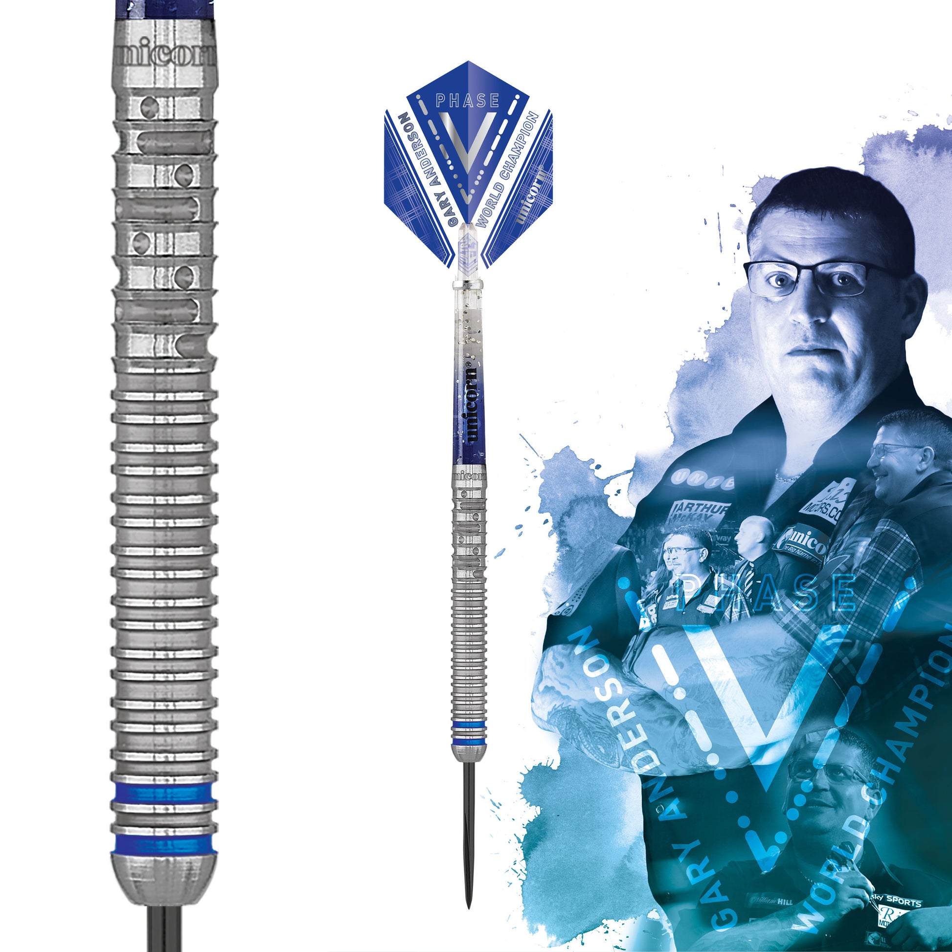 Die neuen Phase 5 World Champion Darts von Gary Anderson sind ähnlich dem Design der Phase 3 Darts angepasst, im hinteren Teil ist der CODE Grip ergänzt. Gary liebt diesen Code Grip und hat schon einige Erfolge in der Testphase damit erzielt. Gary Anderson bevorzugt das Modell in 23g. Das Gewicht ist mit einer Toleranz von +/- 0,1g garantiert. Das Darts-Set ist in 21g, 22g, 23g, 24g und 25g erhältlich. Diese Darts sind in einer hochwertigen 90% Tungsten Qualität gefertigt und sind durch zwei farbige blaue Ringe als WM Darts 2016 unverwechselbar. Die Barrels sind mit dem Unicorn Logo graviert. Die Lieferung beinhaltet 2 Satz Unicorn Gripper 4 Schäfte und Gary Anderson Phase 5 Ultra Fly Ersatz-Flights. Das komplette Set wird in einer DELUXE Player Presentation Box ausgeliefert. Gary Anderson hat seinen WM Titel bei der Darts-WM 2016 verteidigt. In einem hart umkämpften Finale setzte sich der Schotte in London gegen den Engländer Adrian Lewis mit 7:5 Sätzen durch. Gary Anderson ist damit Back to Back PDC World Champion 2015/2016.